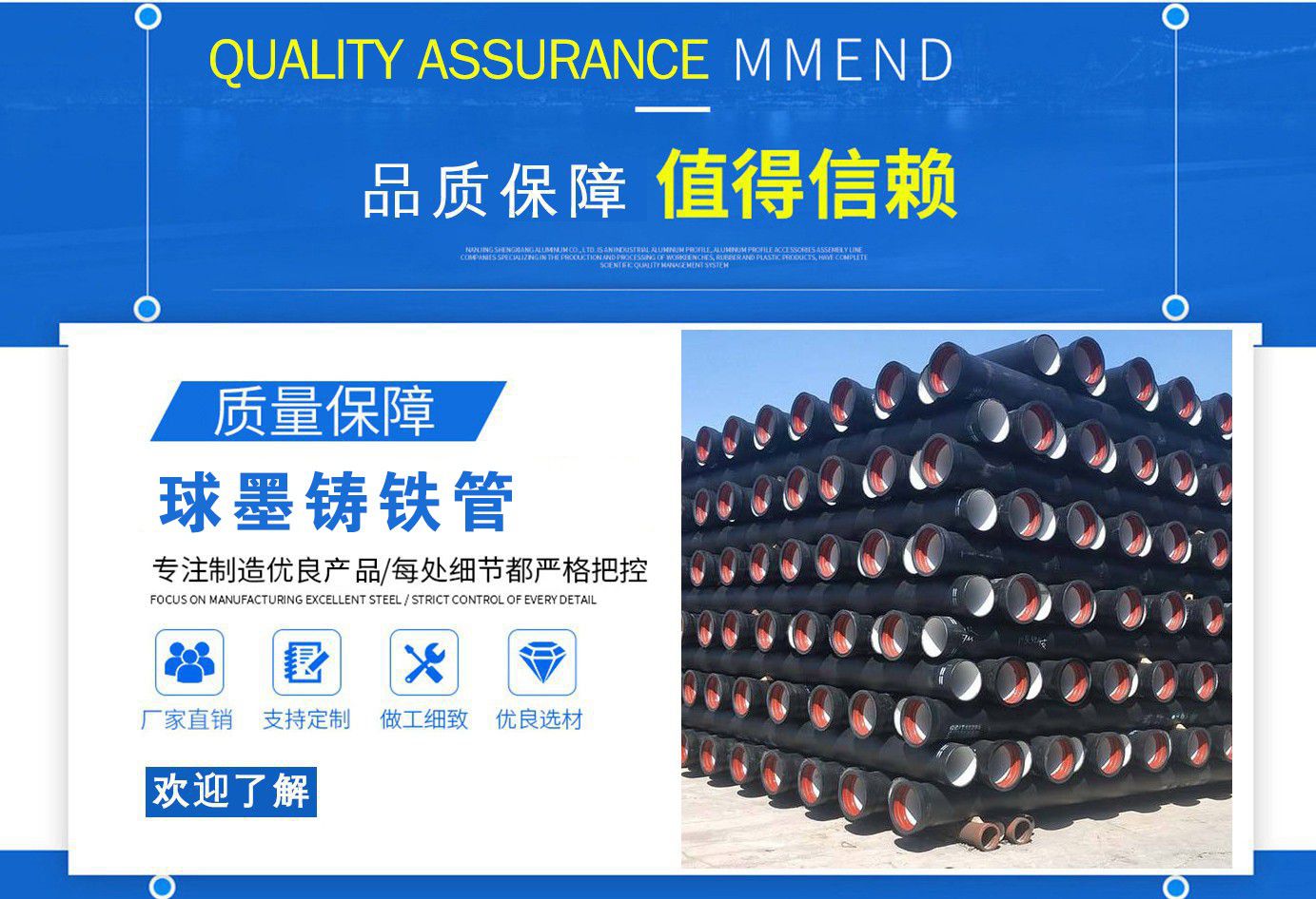 山西飛翔鑄業(yè)有限公司是一家以新興技術(shù)致力于研制開發(fā)、生產(chǎn)、銷售、施工安裝各種球墨管廠家,球墨鑄鐵管價格,國標球墨管,k9球墨鑄鐵管,國標球墨鑄鐵管,離心球墨鑄鐵管等系列鑄鐵產(chǎn)品。公司擁有完善的銷售、售后服務(wù)體系及一支由鑄造專家、工程師組成的精通產(chǎn)品設(shè)備和生產(chǎn)鑄造的技術(shù)力量隊伍。隨著企業(yè)的發(fā)展,我們積累了豐富的鑄造經(jīng)驗與科技水平。使得產(chǎn)品具有高強度、高韌性、耐腐蝕性強等性能。同時,我們獲得質(zhì)量管理體系認證、產(chǎn)品質(zhì)量認證、職業(yè)健康體系認證、環(huán)境管理體系認證。產(chǎn)品暢銷各地并打入韓國、新加坡等東南亞市場。 在未來的發(fā)展中,公司奉行誠信共雙贏,合作創(chuàng)盛世的企業(yè)理念。讓我們一起共創(chuàng)美好未來! 公司產(chǎn)品采用良好的工藝流程,以確保產(chǎn)品質(zhì)量的穩(wěn)定性:以良好的設(shè)備,確保質(zhì)量的可靠性。廣泛應(yīng)用于國內(nèi)外城市的市政建設(shè),通信,自來水,消防,園林,環(huán)保等行業(yè),產(chǎn)品大獲贊譽! 我們有多年的井蓋生產(chǎn)經(jīng)驗,多名老技術(shù)工人有將近二十年的生產(chǎn)經(jīng)驗,還聘請多名新技術(shù)研發(fā)人員,因為我們始終堅信質(zhì)量才是未來生存的根本,只有把質(zhì)量保證了,企業(yè)才會有更加美好的未來。公司堅持用心服務(wù),誠信為本,與時俱進,科技為先的企業(yè)理念,堅持科技先導(dǎo)、竭誠為廣大用戶服務(wù)。歡迎各界朋友蒞臨我公司參觀,指導(dǎo)洽談業(yè)務(wù),相信選擇我們就是選擇我們共贏的明天...